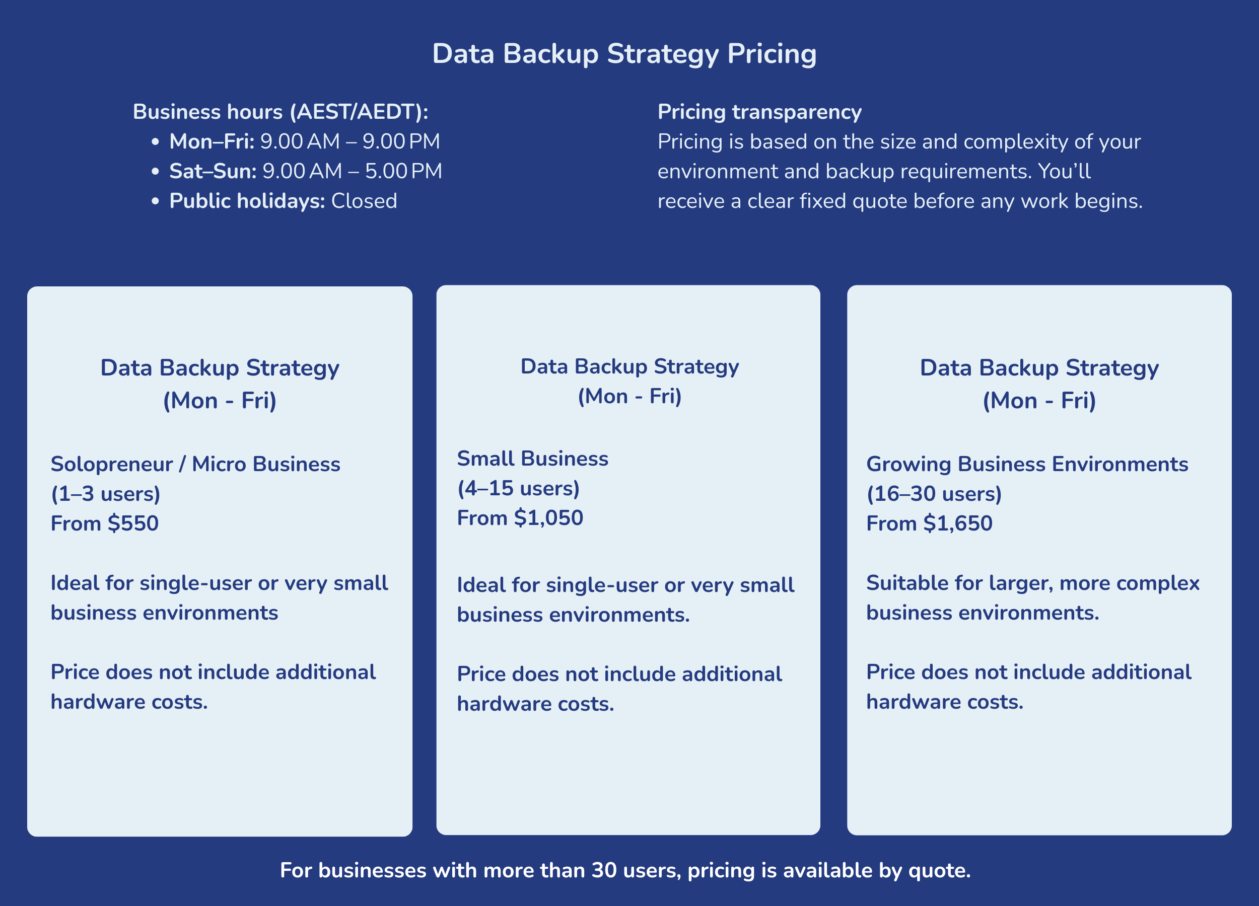 The Data Backup Strategy identifies what information truly matters to your business, evaluates existing backup coverage, and highlights hidden gaps or risks that could lead to data loss. This proactive approach strengthens business resilience rather than relying on assumptions or default settings.